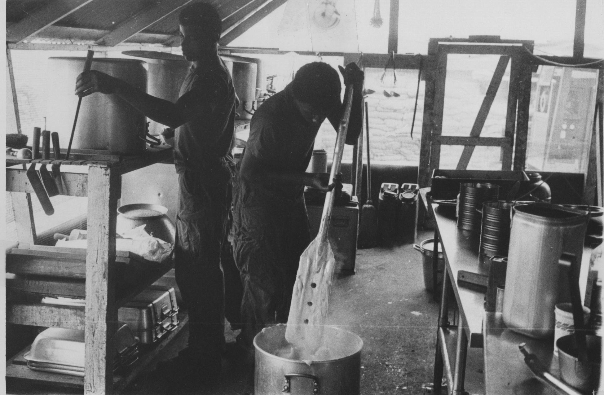 LZ Hawk Hill, Vietnam (Americal IO)--They cool for the infantry. Two 3rd Battalion, 21st Infantry, 196th Infantry Brigade cooks prepare a meal for Americal Division soldiers on LZ Center and infantrymen in the field 15 miles away.