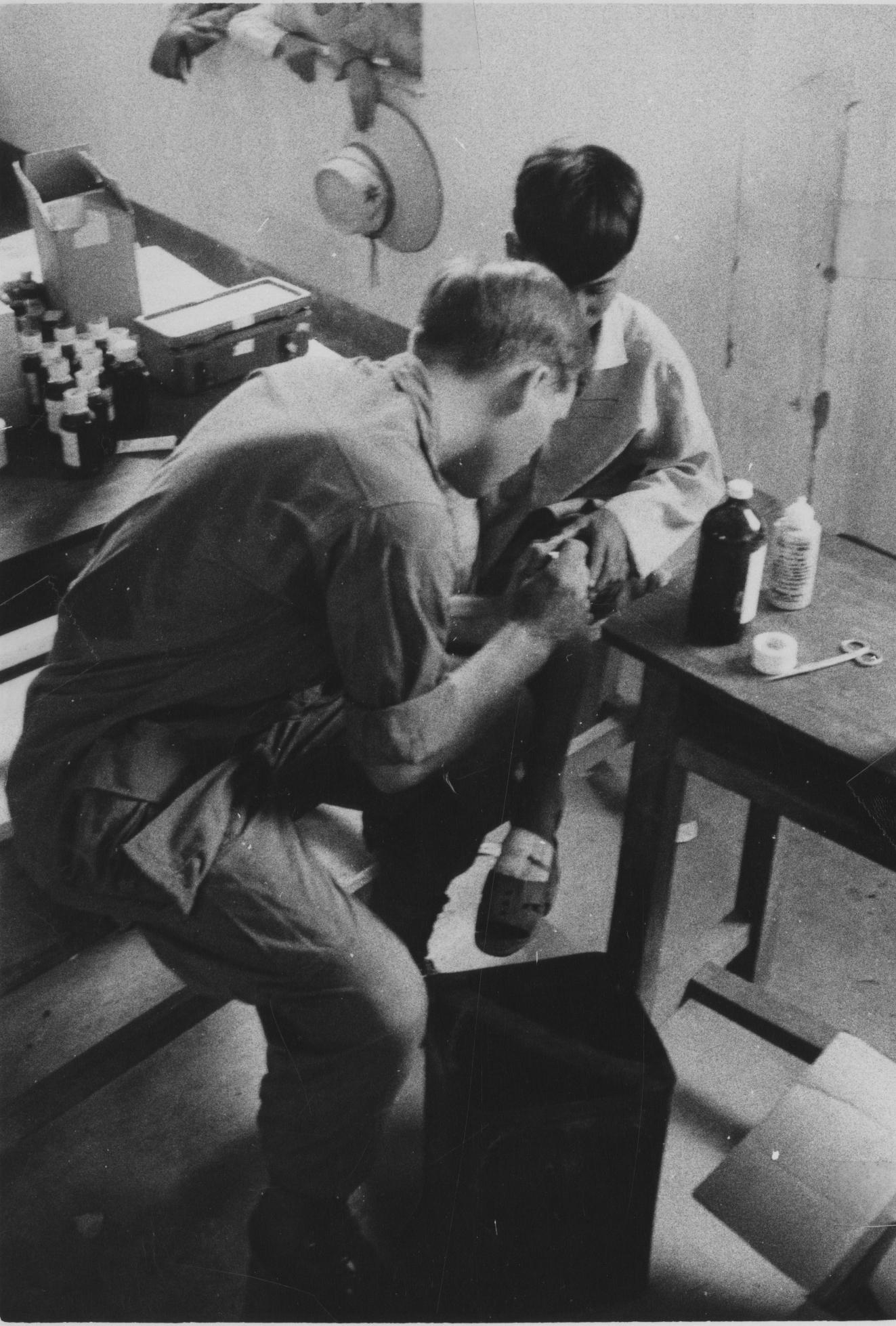 CHU LAI, Vietnam (Americal IO)--First Lieutenant Charles Park (West Hartford, Conn.) gives emergency treatment to an Americal soldier wounded in a fire fight. The soldiers are members of D Co. 1/52, 198th Inf. Bde., Americal Division.