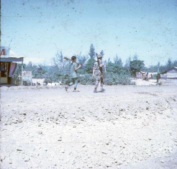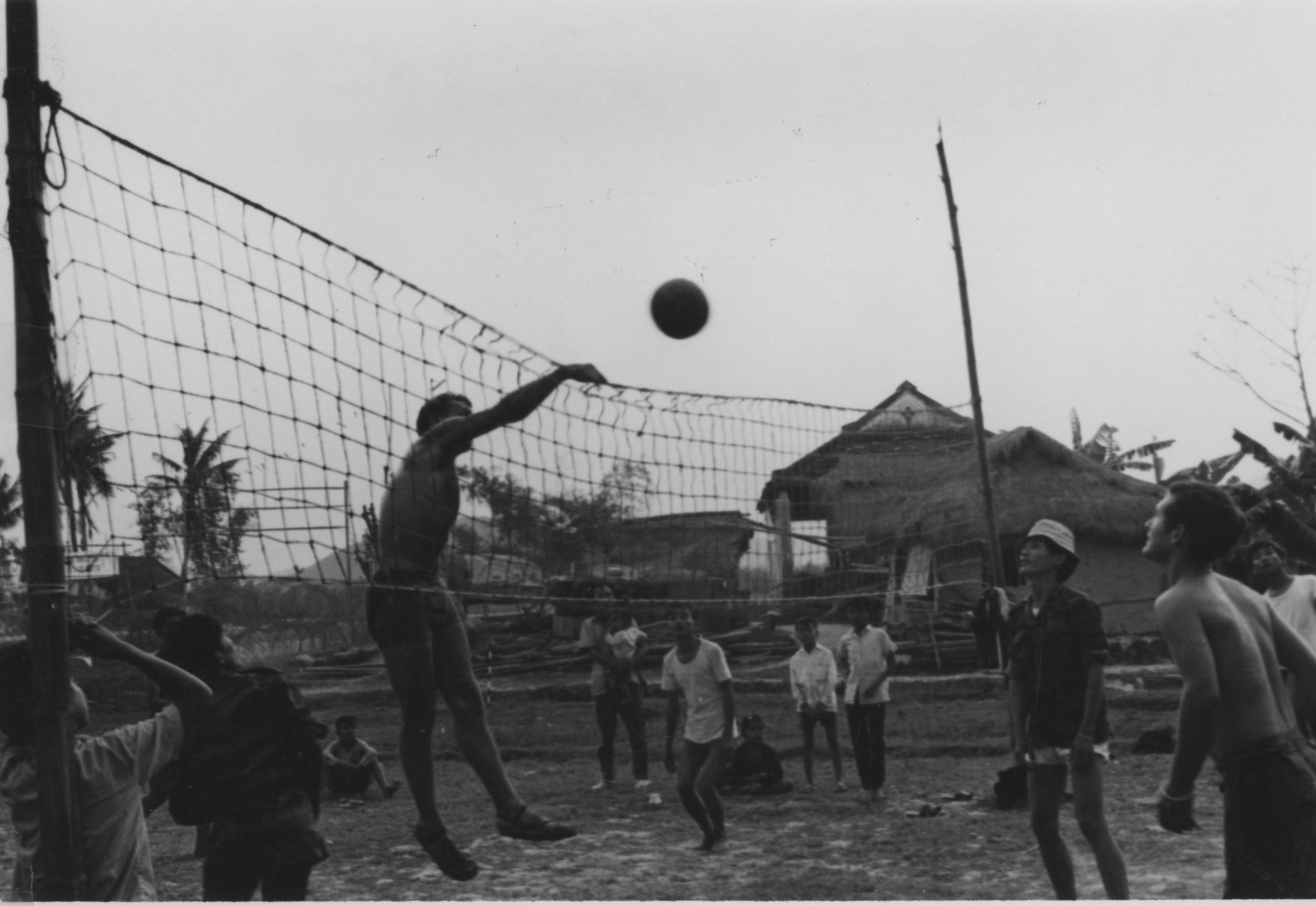 VAN TROUNG, Vietnam (Americal IO)--11th Brigade soldiers of Company B, 1st Battalion, 20th Infantry, Americal Division, play an after-dinner game of volleyball with their Popular Force counterparts. Both jointly provide security for the pacification hamlet two miles north of Duc Pho.