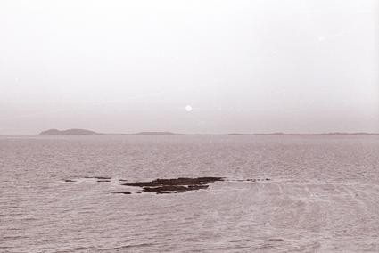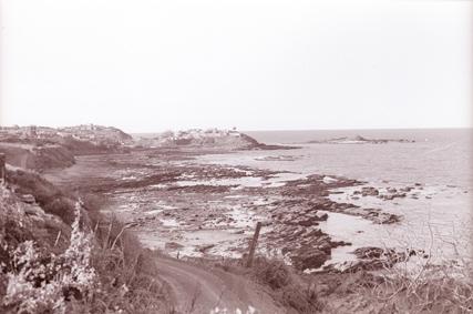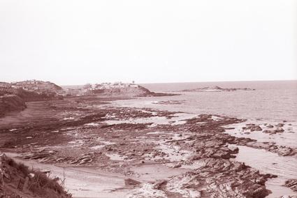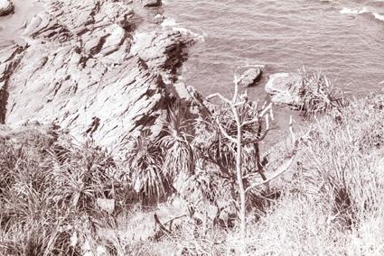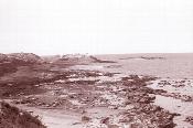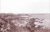 View down steep hill from 91st Evacuation Hospital to rock shoreline