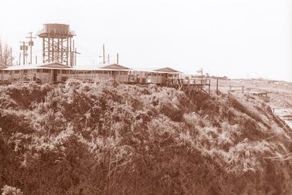 View from mess hall or 91st Evacuation Hospital Officers Club toward BOQ's and Boys Camp deck and hillside below 91st Evacuation Hospital