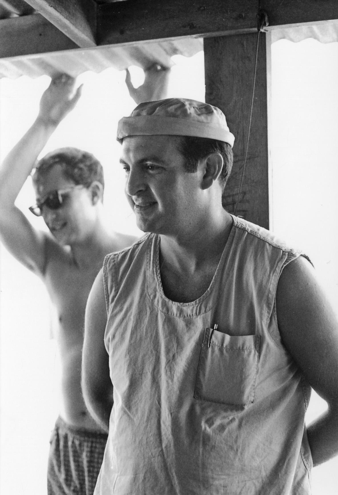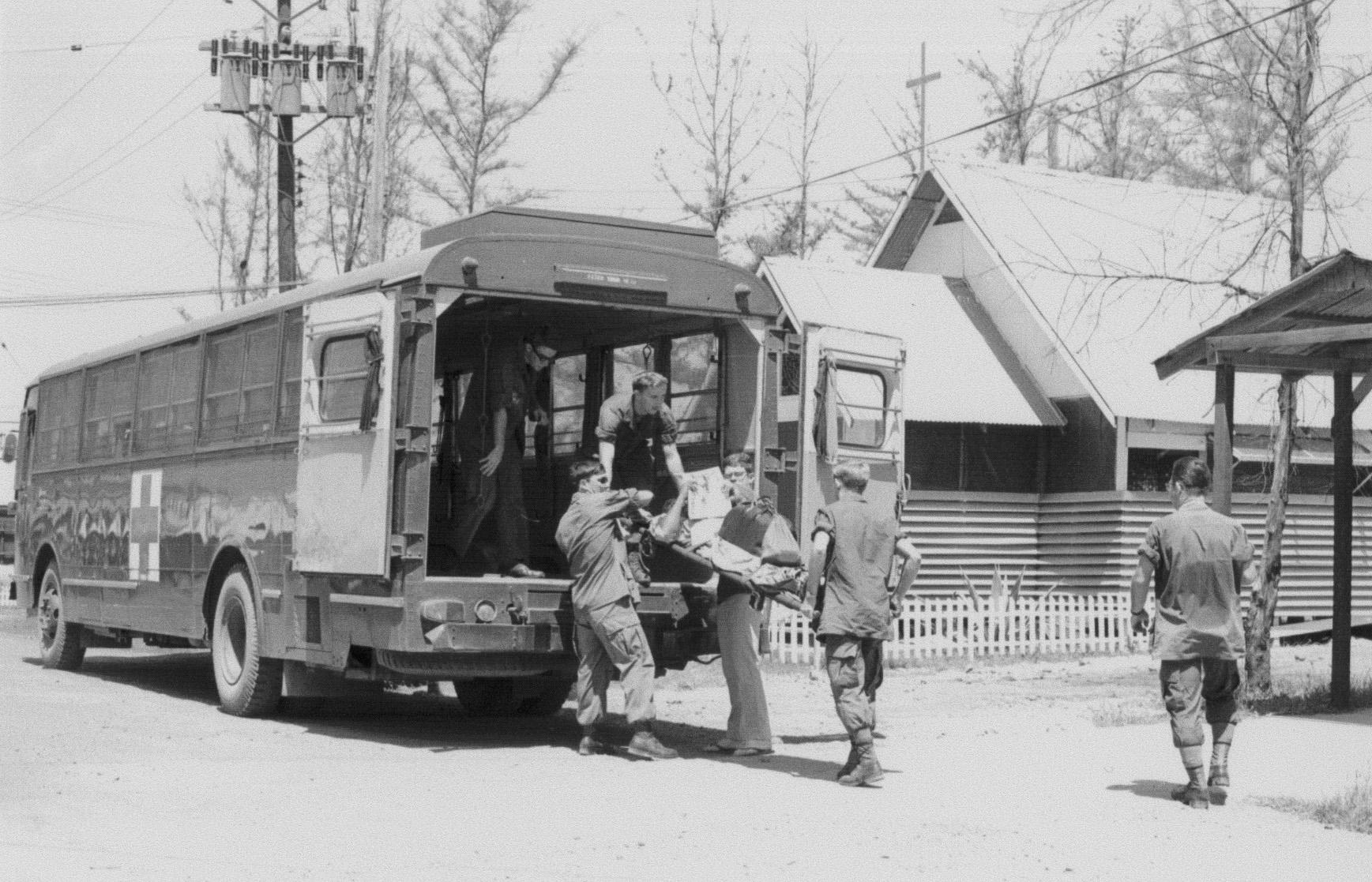View through porch battalion aid station. Medic Hut, left Medic Rocy Bampanni [Spelling of name is uncertain], back to camera, ARVN on stretcher with self-inflicted wound to foot in backgraound. The ARVN was pissed off when he learned he would be evacuated to Chu Lai; he apparently wanted to go to DaNang where he could easily disappear.
