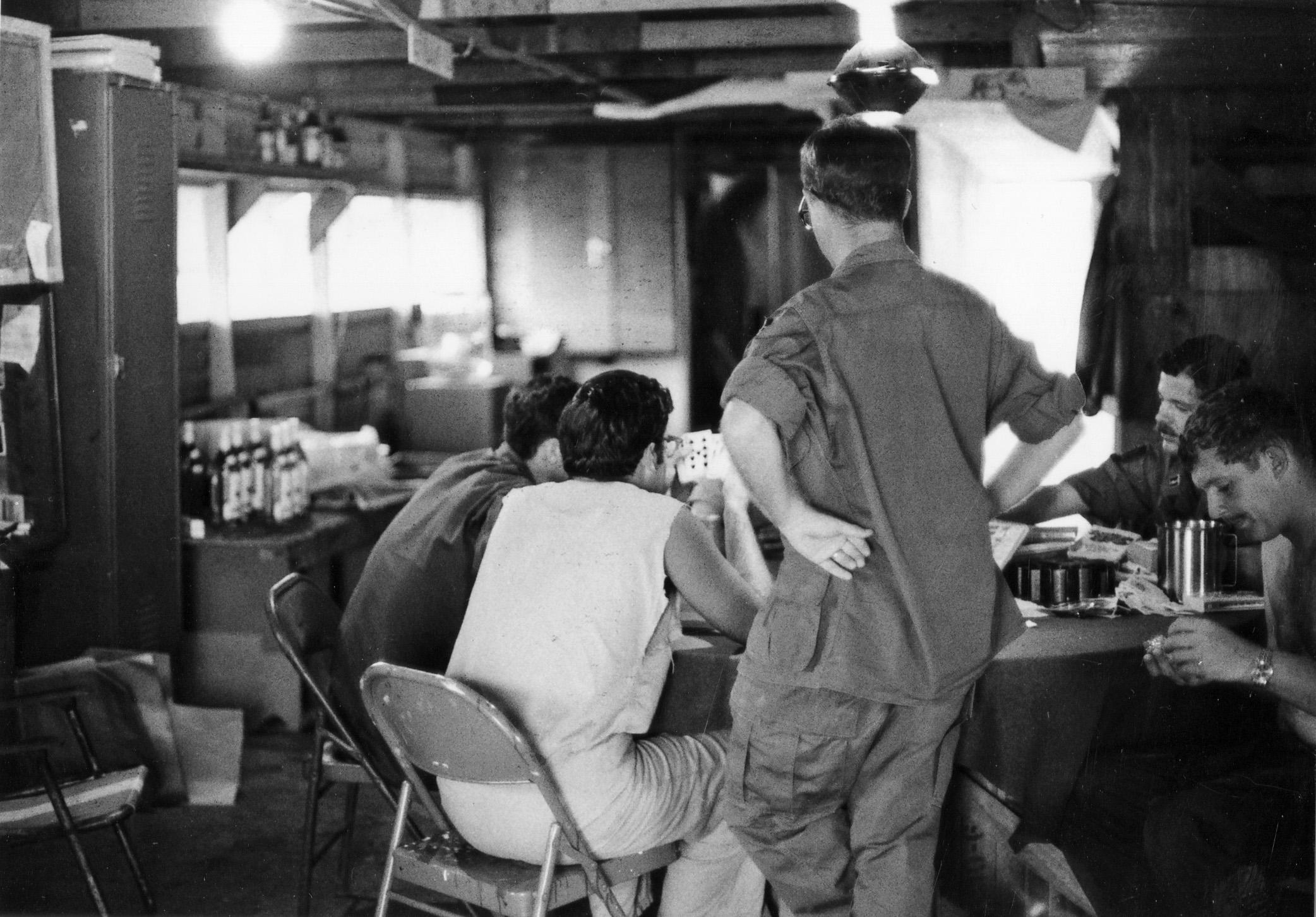 Playing cards on porch battalion aid station. Medic Eason, back to camera; Medic McCullough on left; Medic Rocky Bampanni, middle background; infantry man, Bruno, right.