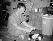 1st Lt. Paul L. Sauer outside hootch, Quang Tri Combat Base, painting stapler with red paint. He is standing on PSP panels.