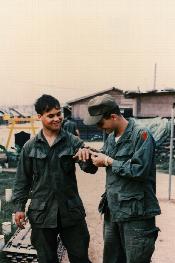 1st Lt. Paul L. Sauer, Medical Service Crops, on left with camera, and 91-C Medical specialist Mark Doom. Building in background was 1/77 Officers Club