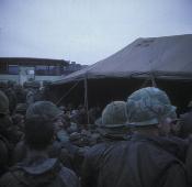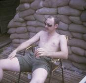 1/77 Armored Battalion Medical Aid Station, Quang Tri Combat Base; 01 December 1969, views made during 1/77 Armored Battalion convoy from Quang Tri Combat Base along QL 1 Sergeant Washburn, NCO for 1/77 medical platoon, drinking coffee outside 1/77 Armored Battalion medical aid station.