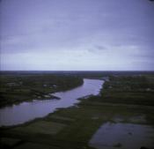 Aerial views northern Quang Tri Province, Alpha 4, aerial views near Quang Tri Combat Base, Quang Tri Combat Base Aerial view from helicopter, facing east, Quang Tri River, bridge and Quang Tri City on right