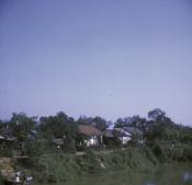 1/77 Armored Battalion Medical Aid Station, Quang Tri Combat Base; 01 December 1969, views made during 1/77 Armored Battalion Convoy from Quang Tri Combat Base along QL1 Houses by stream along QL1('Dong Ha' marked out on cardboard mount)