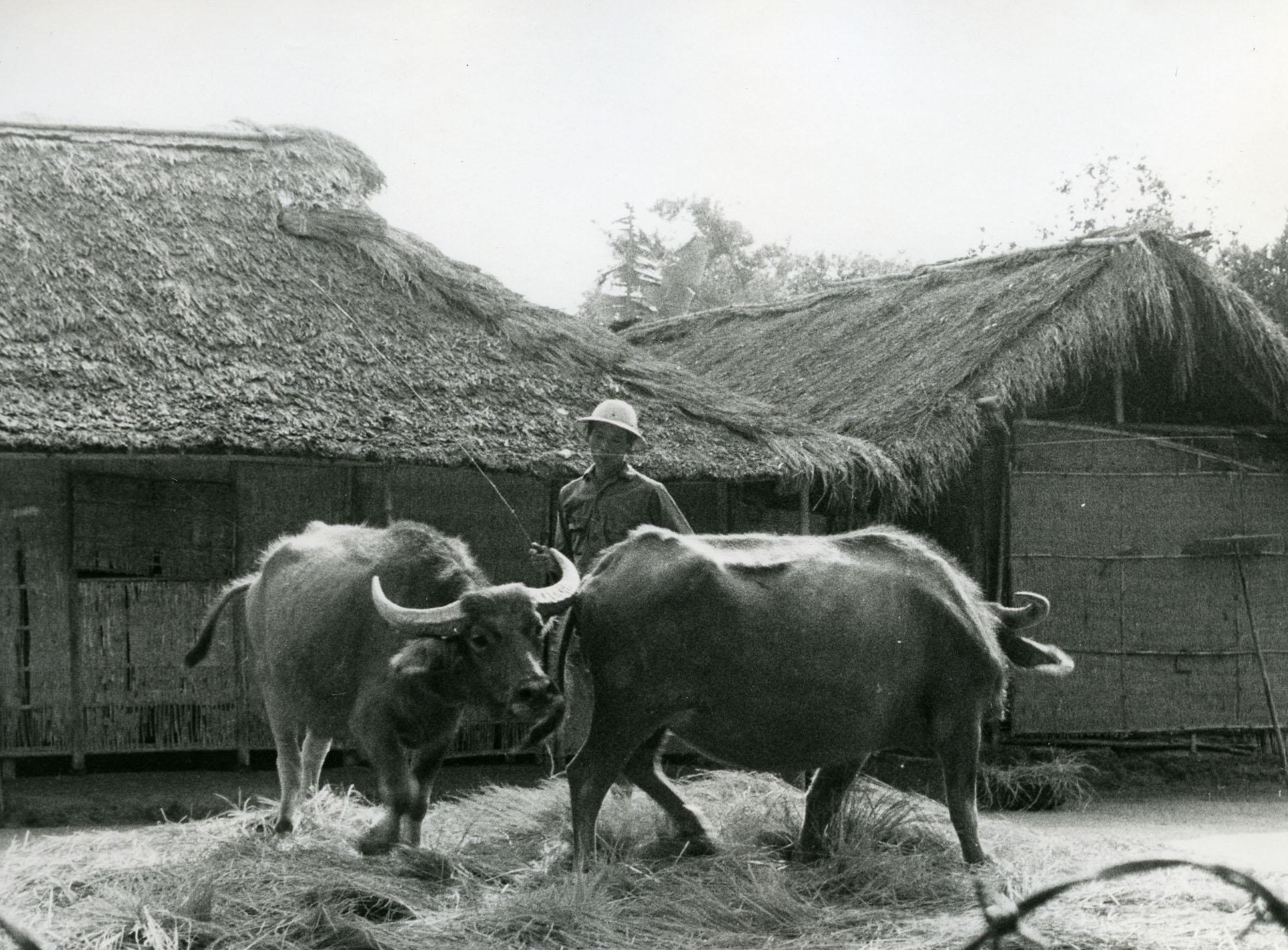 Subject: Vietnamese farmer with two water buffalos threshing rice.