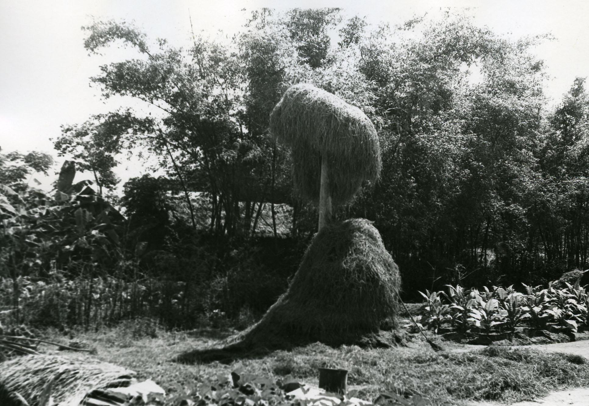 Subject: Vietnamese man and child against haystack.