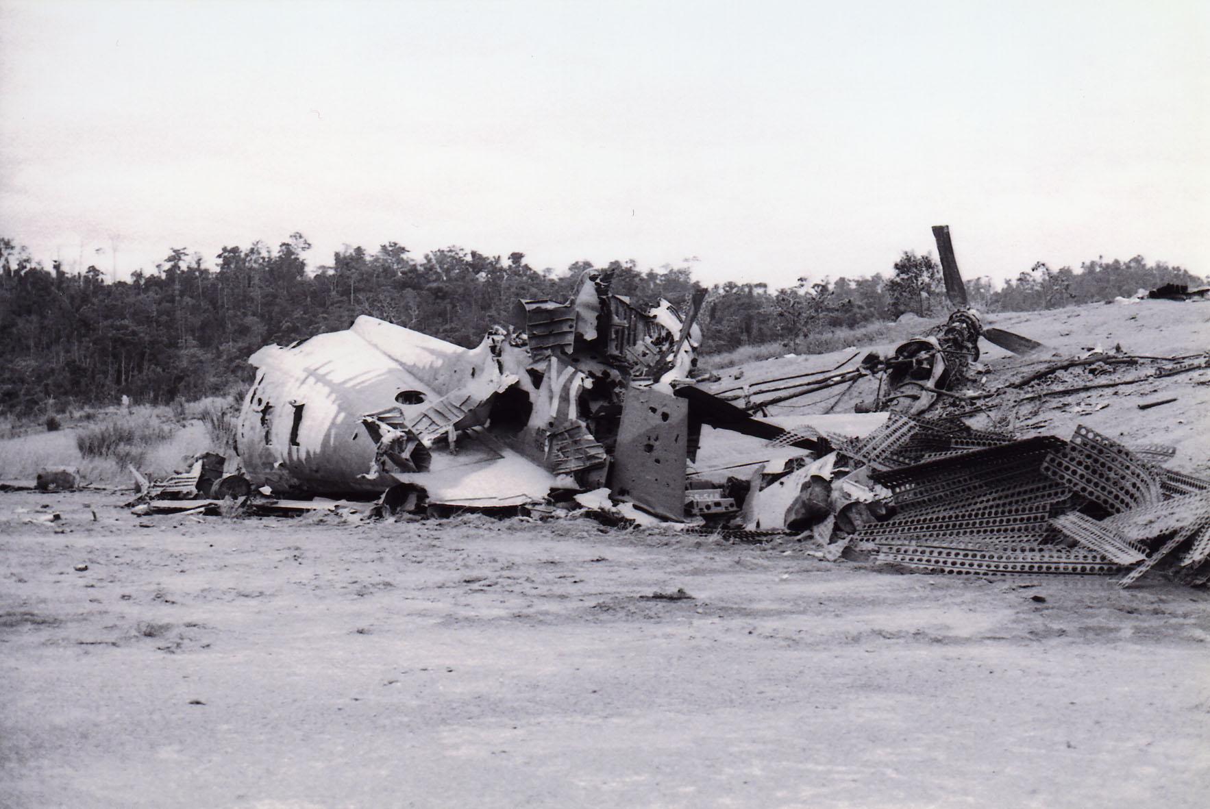 Kham Duc bunkers. Fixed wing aircraft on left. View toward southwest end of the runway.