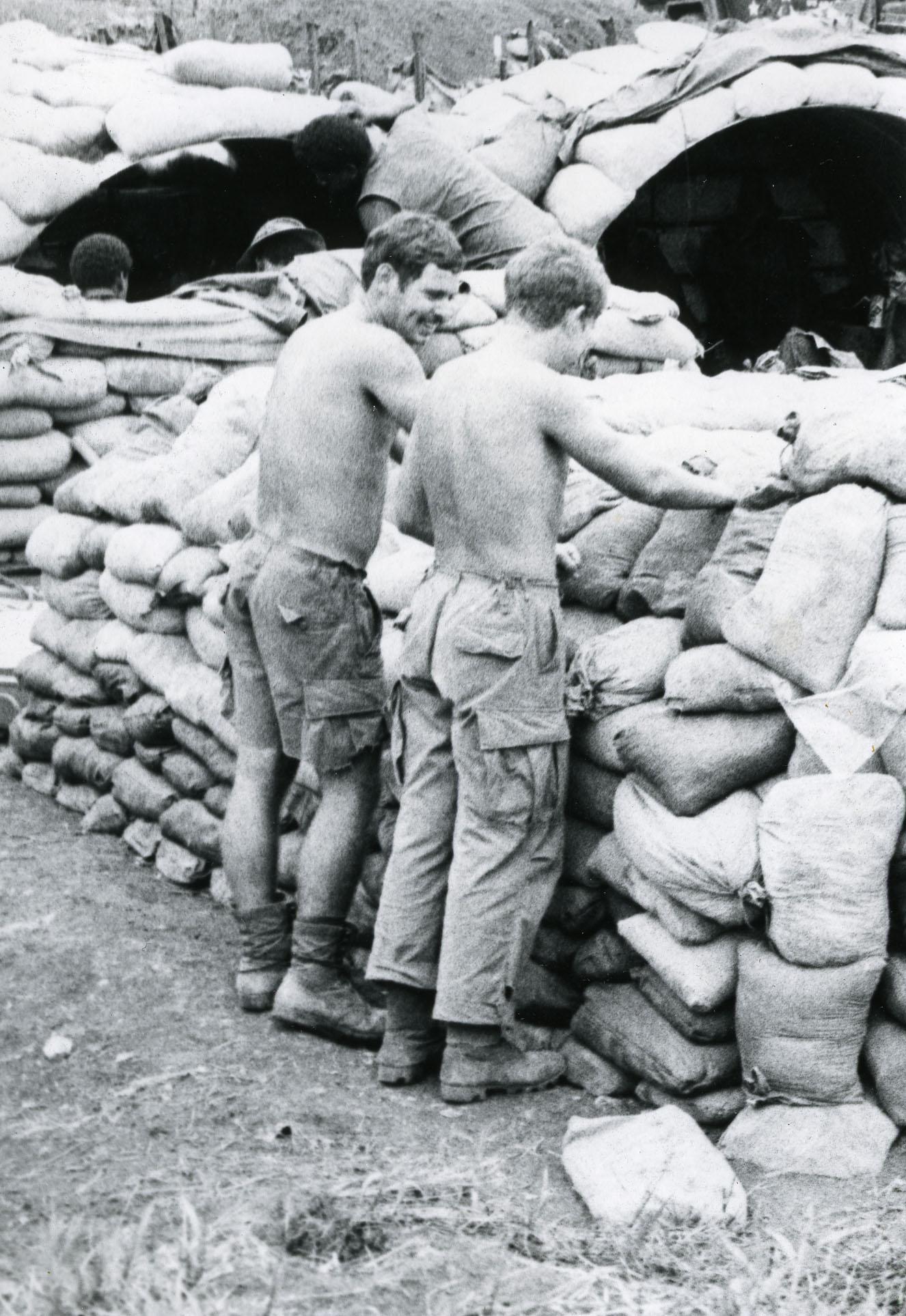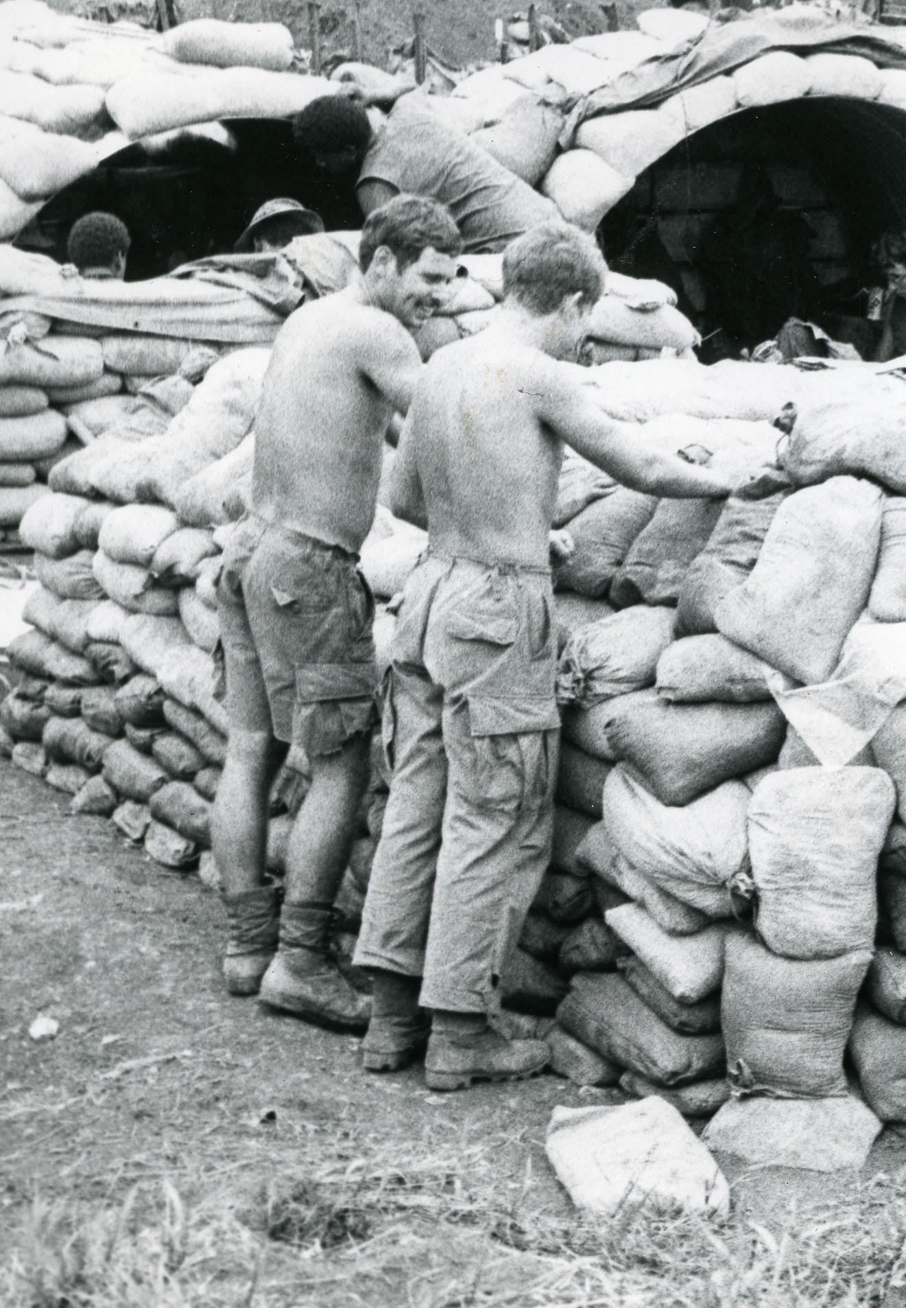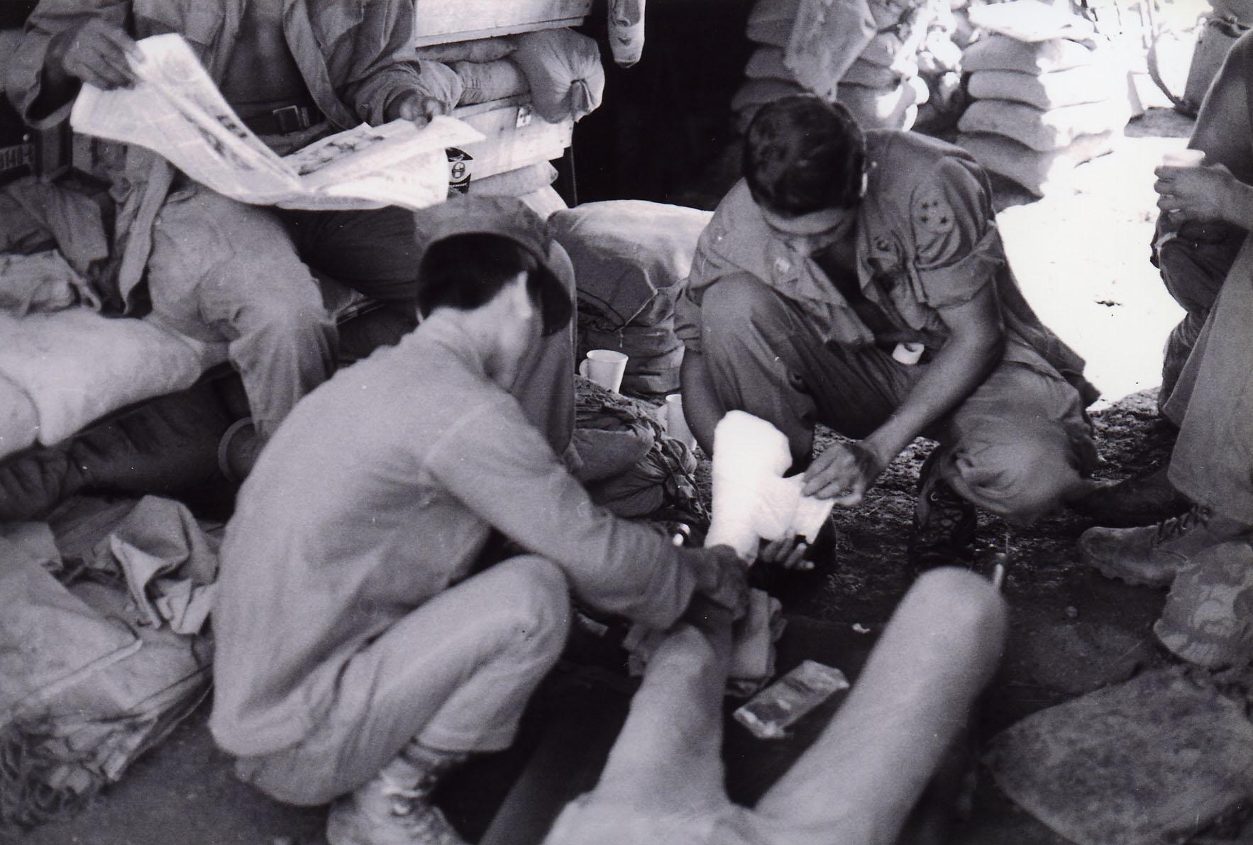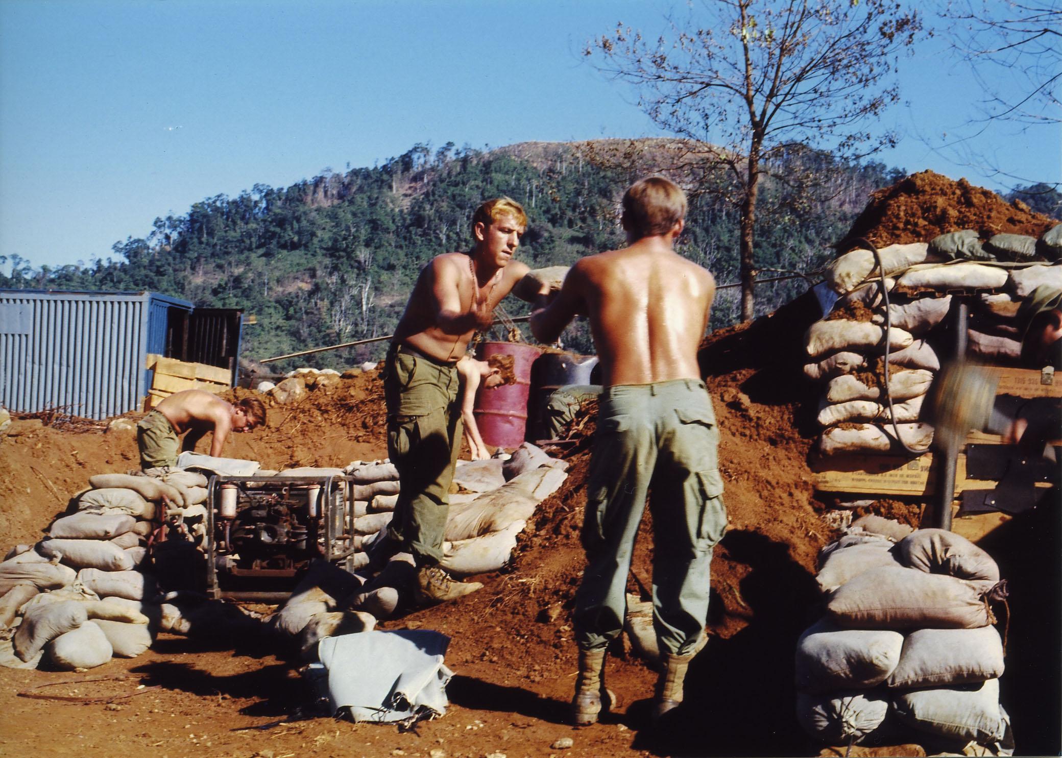 Medics filling sandbags with dirt. Sandbags protected generator that provided electricity for lights and blood refrigerator in the medical aid station. Seated medic on left, unknown; standing medic with back to camera, unknow; seated medic with blonde har, Eason; medic with back to camera, Hunt; medic on right tying sandbag, unknown; medic Rocky Bampanni behind last soldier. In background medevac helicopter crew.