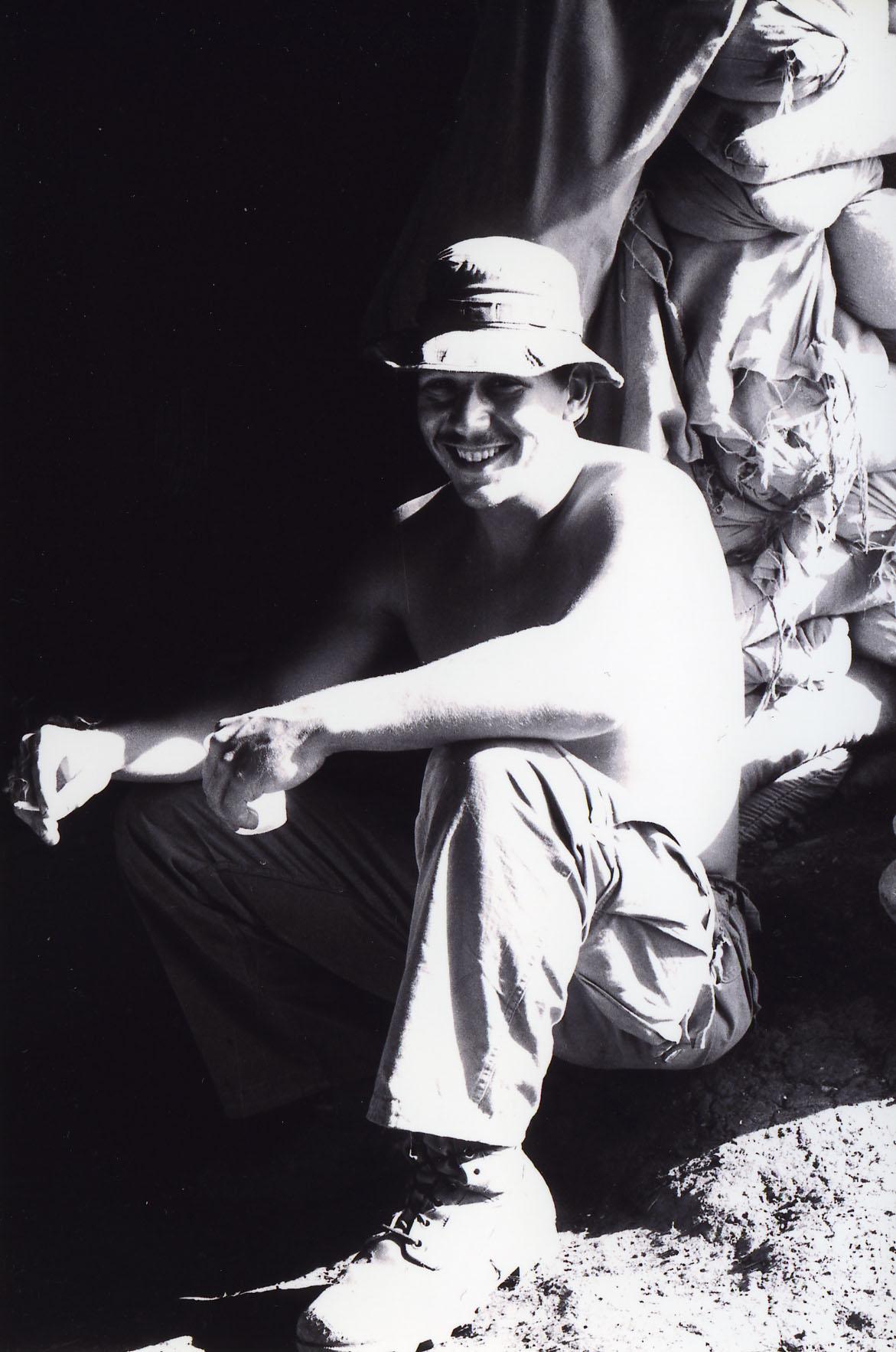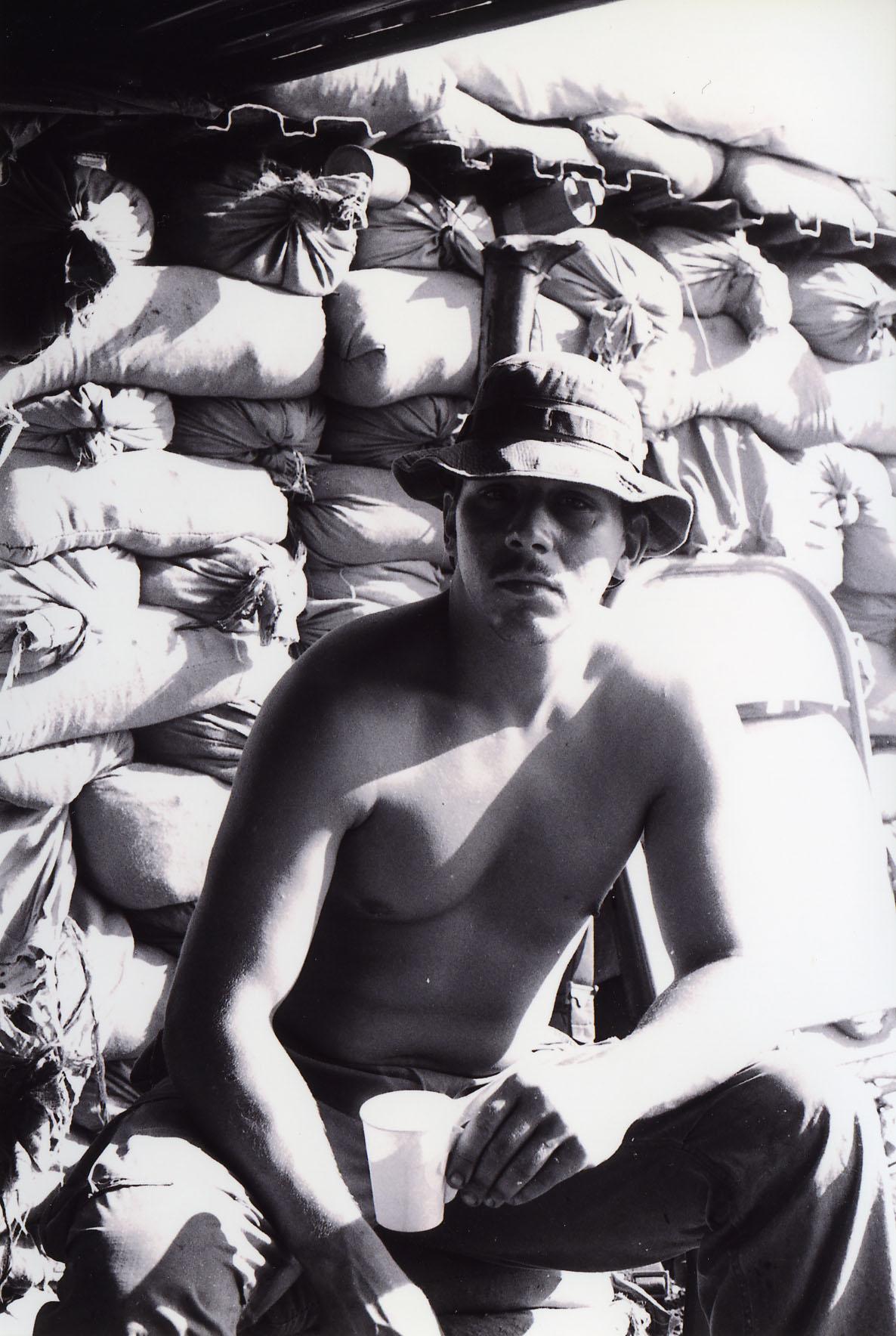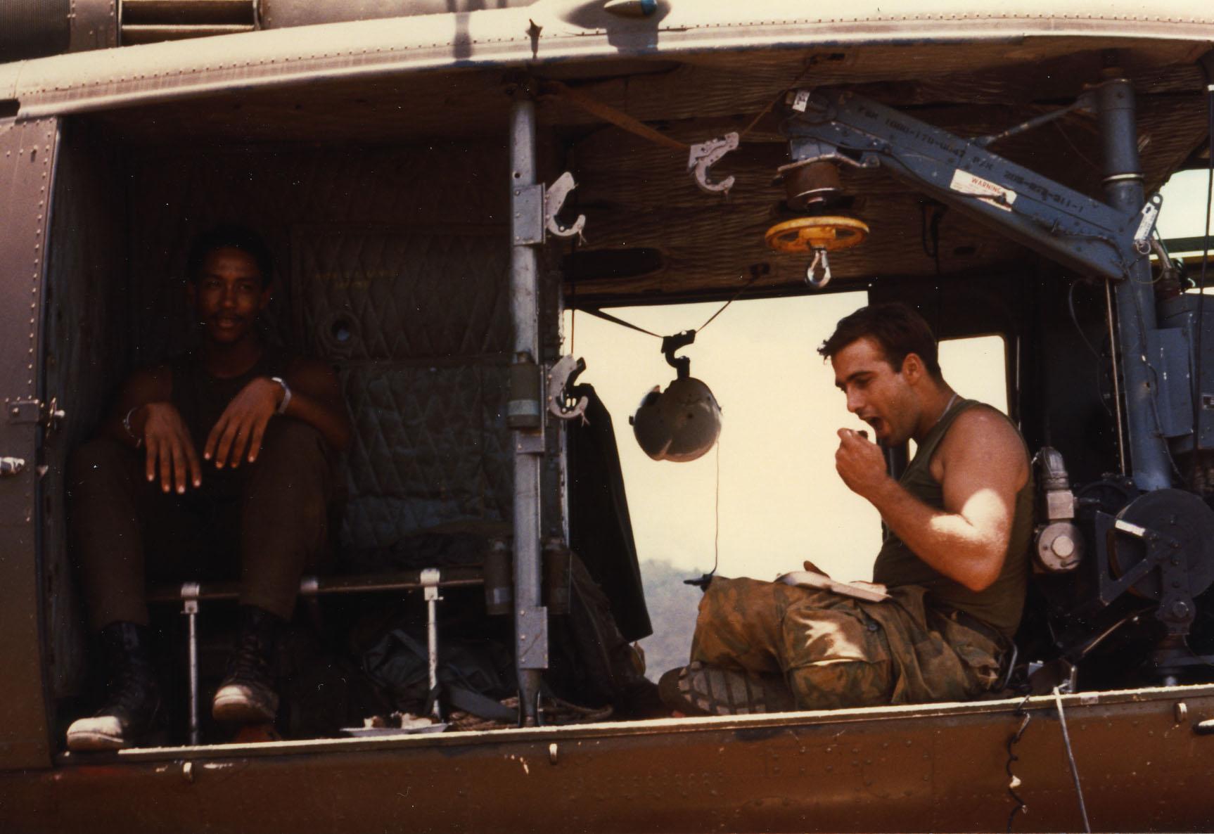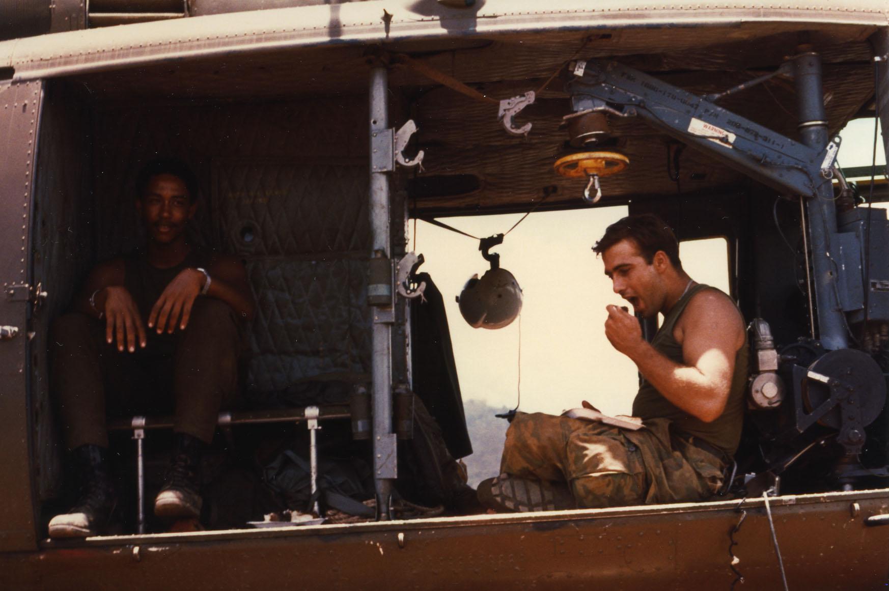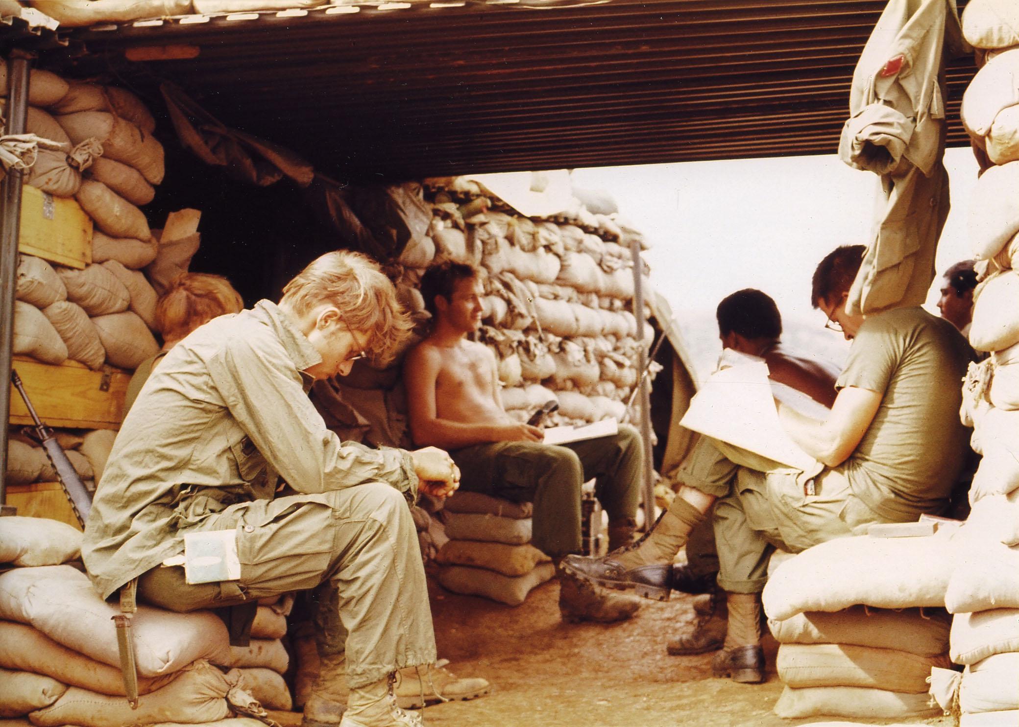 Medics filling sandbags with dirt. Sandbags protected generator that provided electricity for lights and blood refrigerator in the medical aid station. Seated medic on left, unknown; standing medic with back to camera, unknow; seated medic with blonde har, Eason; medic with back to camera, Hunt; medic on right tying sandbag, unknown; medic Rocky Bampanni behind last soldier. In background medevac helicopter crew.