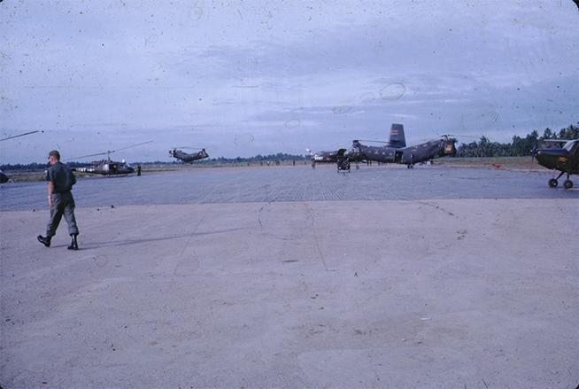 The scrapbook consists of some clippings of U.S. propaganda in Vietnamese (1964) and a collection of photographs depicting aerial and base shots of helicopters. These photographs also depict Saigon Port, soldiers fixing a helicopter, a Special Forces Camp near Laos, Vietnamese prisoners, Camp Holloway, Pleiku, Huey helicopters, Recovery operations for the 995 helicopter, a bear, a typhoon at Danang, and several shots of helicopter pilots together.