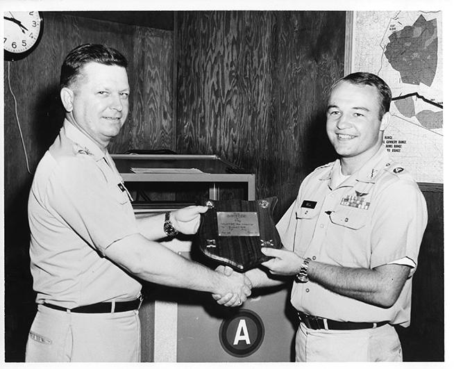 Colonel George E. Thayer Jr. presents Cpt. Richard E. Bell with a plaque in memory of service with the Plans, Operations and Aviation Division, DPT and SECTY, during a ceremony held 21 September, 1970 at Ft. Stewart.