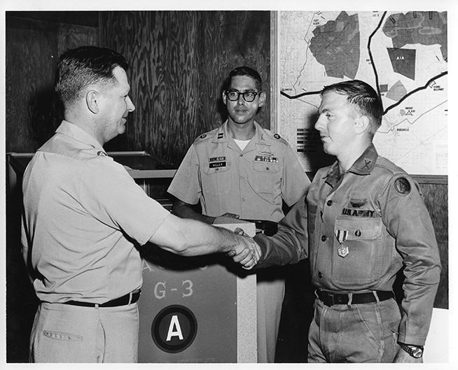 Colonel George E. Thayer Jr. congratulates Cpt. Larry D. Cole on his being awarded the Army Commendation Medal during ceremonies hed at Ft. Stewart. Reading the orders id Cpt. William R. Miller.