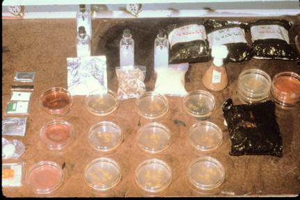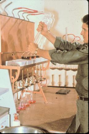 US Army Veterinary Servicers, 9th US Army Medical Laboratory, 1st location (May-Dec 1966) Old Plantation Road, 3K's South Tan Son, Nhut toward Cholon, Showing entry to Veterinary Dept. of 9ML and Veterinary Laboratory Activities, Protein analysis of foods
