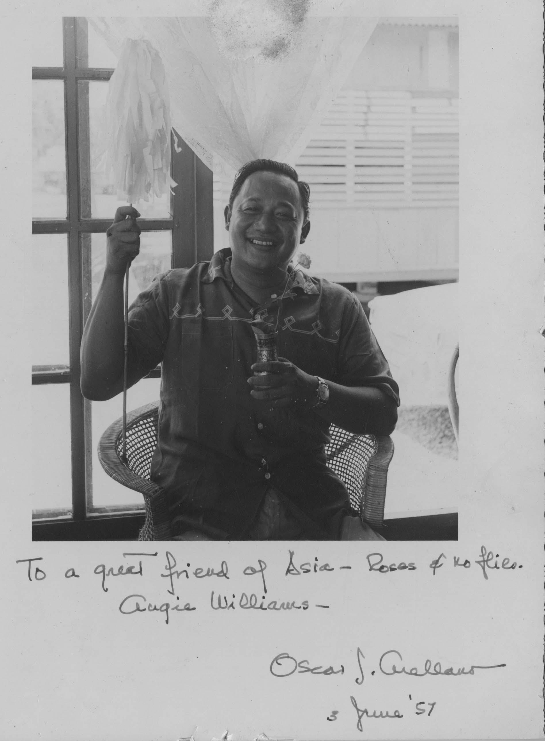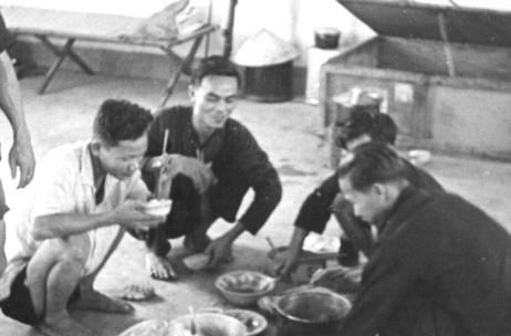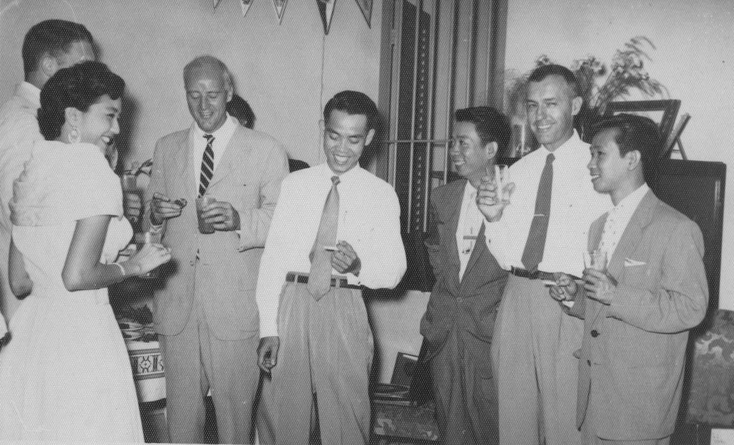 Sophie Bary (?), Birthday - Spring 1956, Saigon; Ruben Phillips, Sophie Bary (?), (illegible name), Ogden Williams