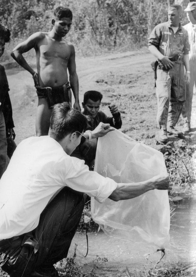 Mr. Kim, Vietnamese Agriculture specialist at village being given fish for their pond.