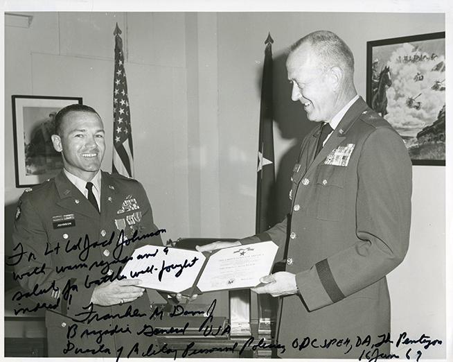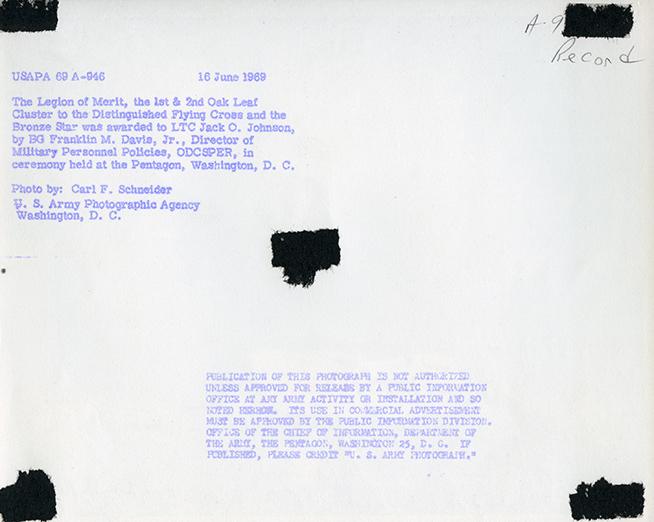 The Legion of Merit, the 1st and 2nd Oak Leaf Cluster to the Distinguished Flying Cross and the Bronze Star was awarded to LTC Jack O. Johnson, by BG Franklin M. Davis, Jr., Director of Military Personnel Policies, ODCSPER, in ceremony held at the Pentagon, Washington, D.C.
