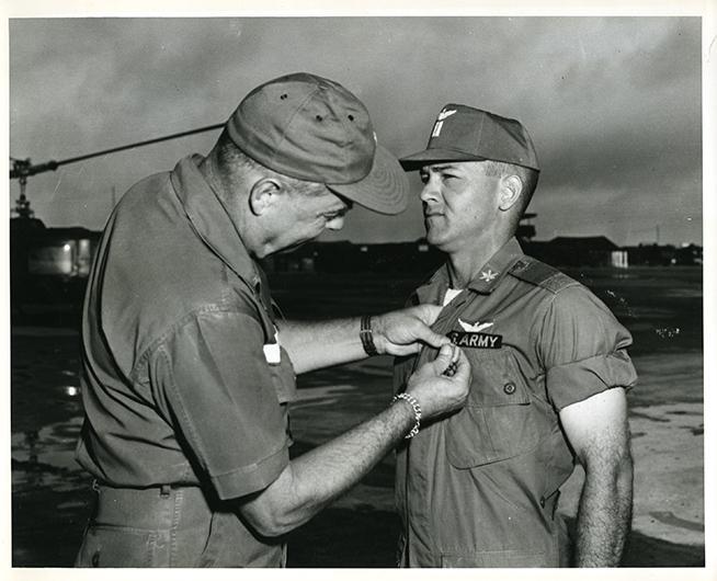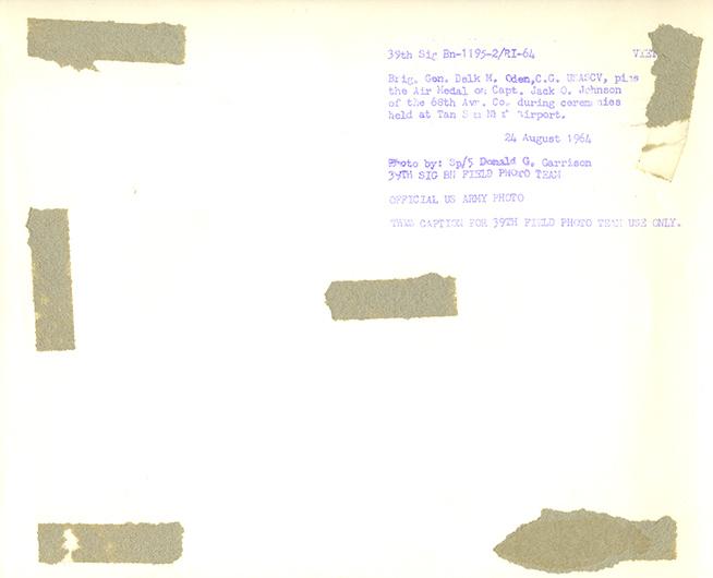 Brig. Gen. Delk M. Oden, C.G. USASCV, pins the Air Medal on Capt. Jack O. Johnson of the 68th Avn. Co. during ceremonies held at Tan Son Nhut airport.