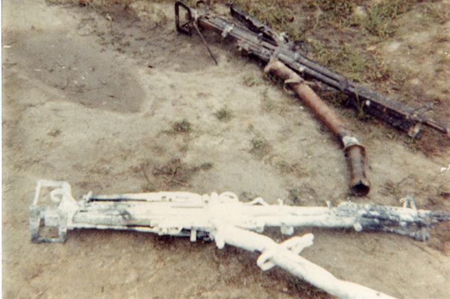 "Aerial view of a wrecked UH-1D helicopter from the 269th Avn Bn, 25th Inf. Div."