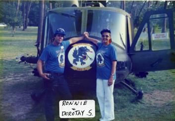 Ronnie and Dorothy S. standing in front of a helicopter.