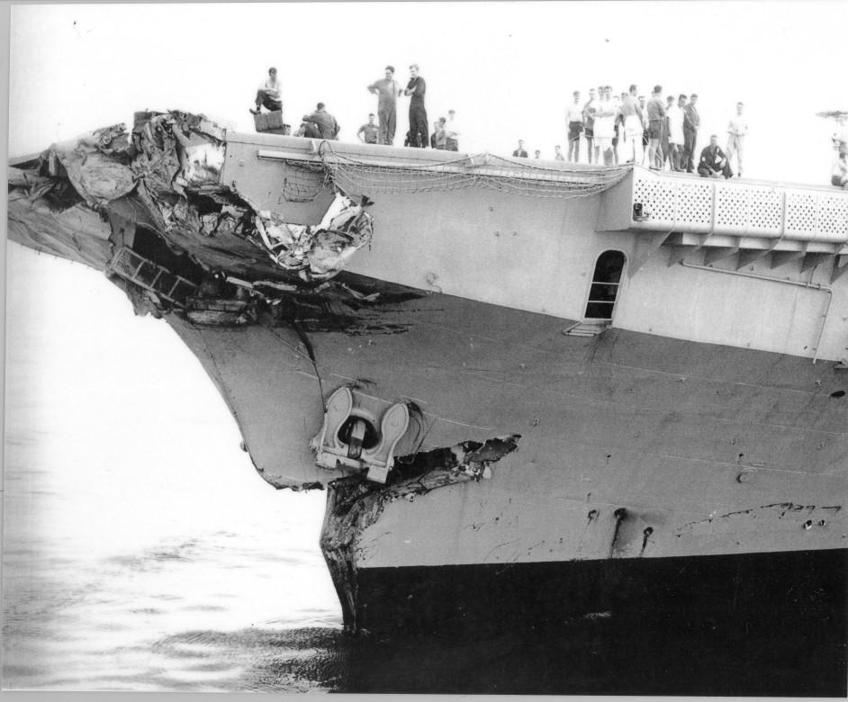 View of bow of ship following a collision.