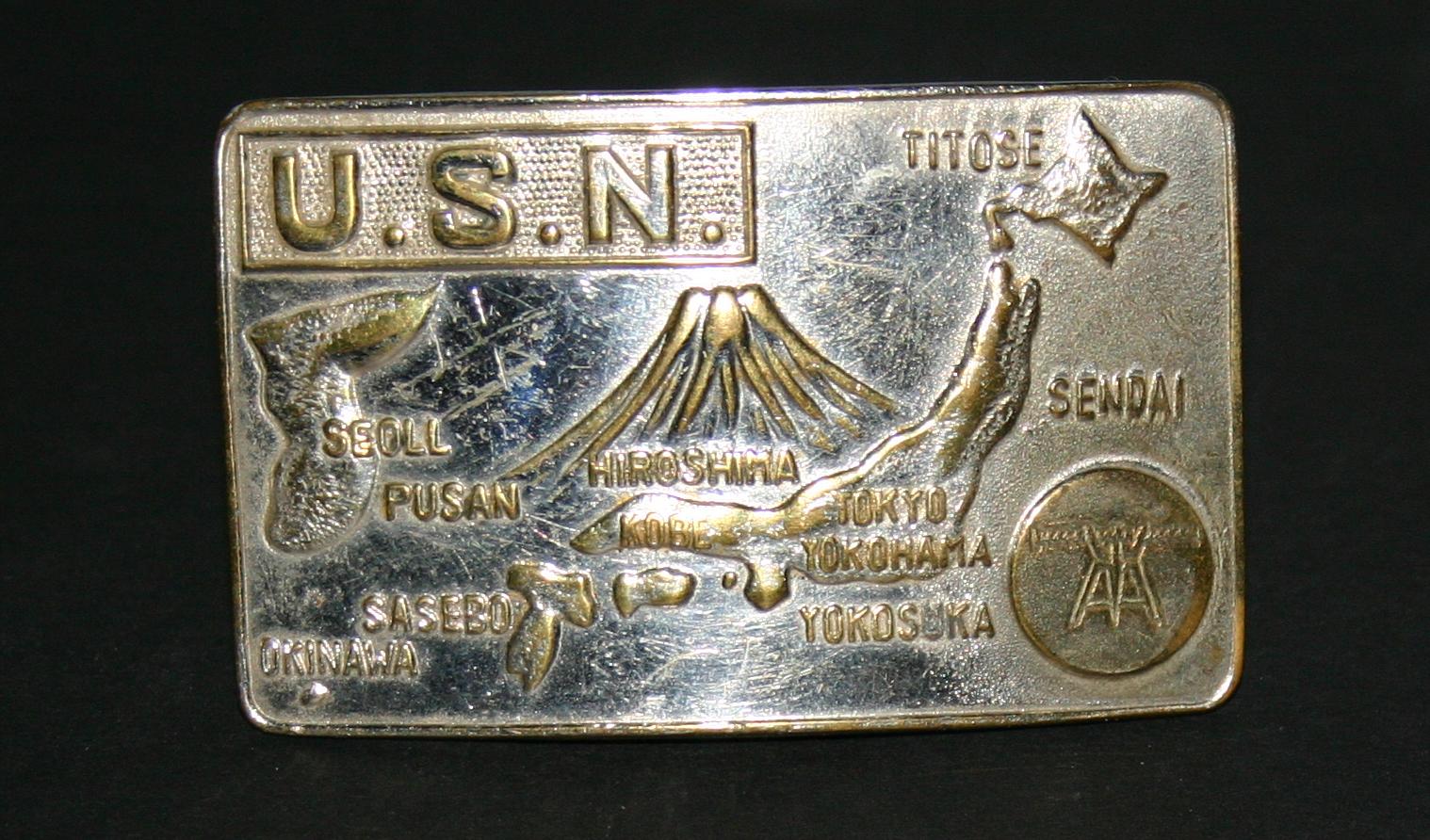 Belt buckle with USN in upper corner and embossed silhouettes of Korea, Mount Fuji, Okinawa and Japan. The following locatons are also embossed: Seoll, Pusan, Sasebo, Okinawa, Hiroshima, Kobe, Todyo, Yokohama, Yokusuka, Sendai, and Titose.