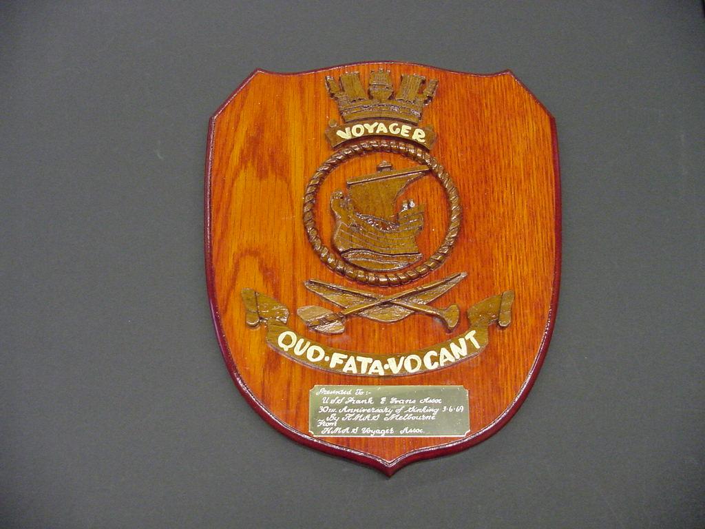 A small wooden plaque given to the Frank E. Evans Association by John Hannay, Secretary of the HMAS Voyager Survivors Assocaition.