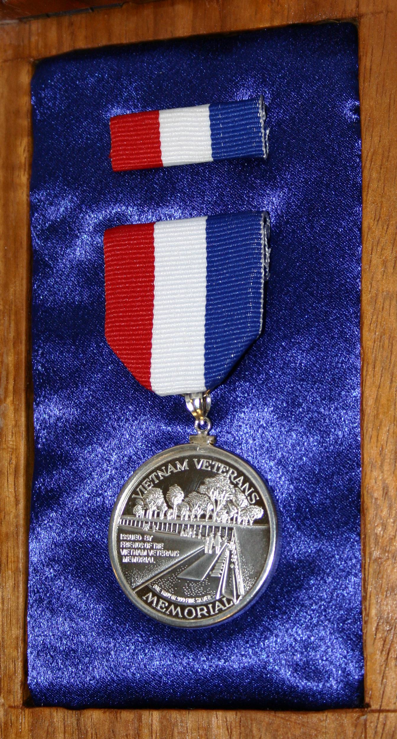 Vietnam Veterans Memorial commemorative coin attached to red, white and blue ribbon, engraved on back 'J.C. Campbell, USS Frank E. Evans, June 3, 1969, 334-35-88' in presentation box.