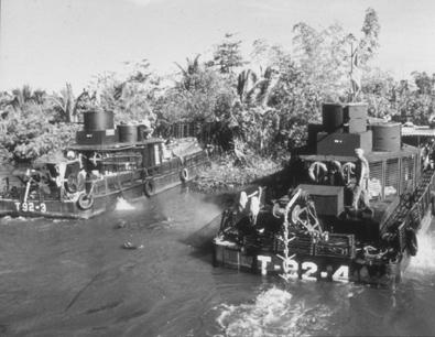 An American Navy river boat crossing paths with a Vietnamese civilian ship.