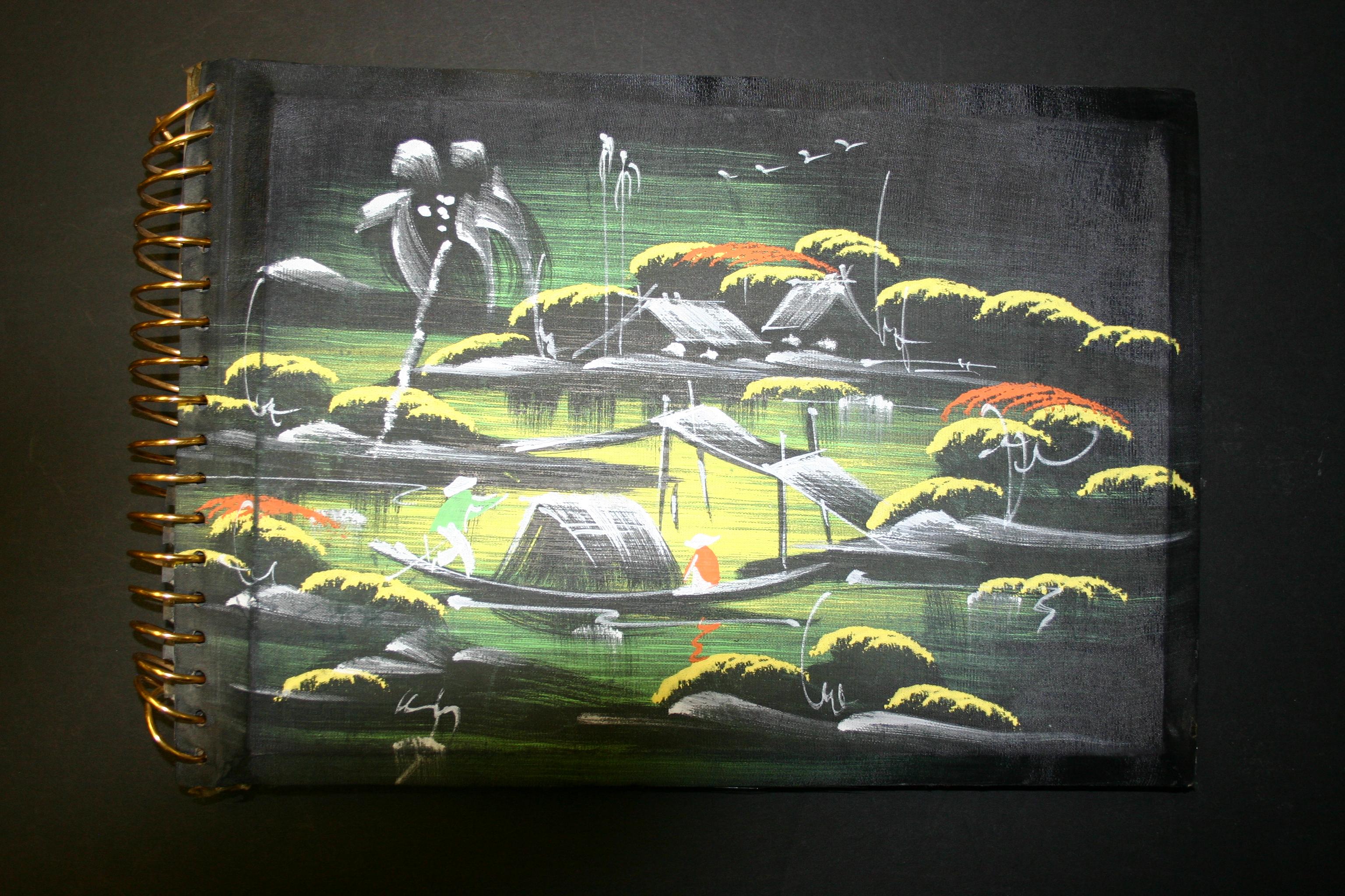A scrapbook with a cover decorated by Vietnamese artwork. The scrapbook did house all of the documents and clippings from the Greg Burch Collection.