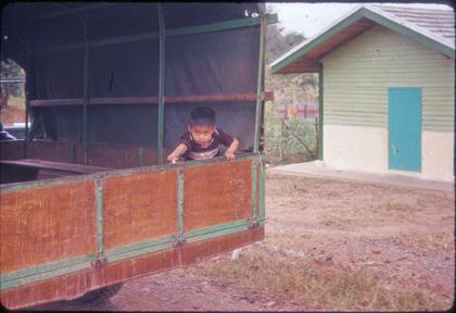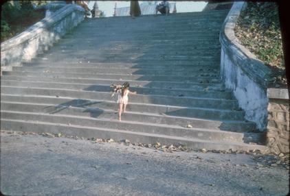 Child carrying wood from boat up steps - Wat Xieng Thong.