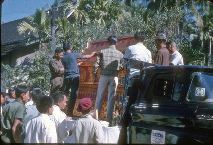 Putting casket on truck.