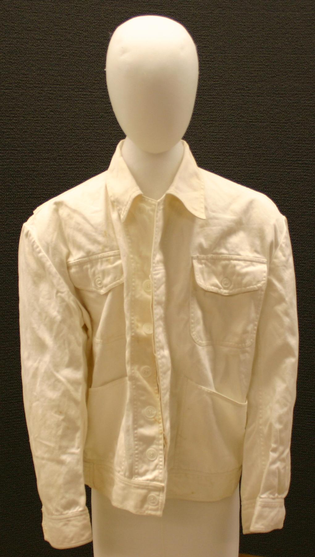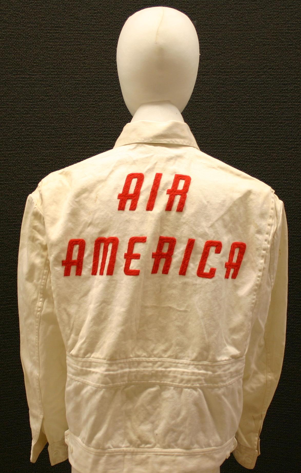 Air America maintenance jacket. The jacket is white with Air America embroidered on the back in red.
