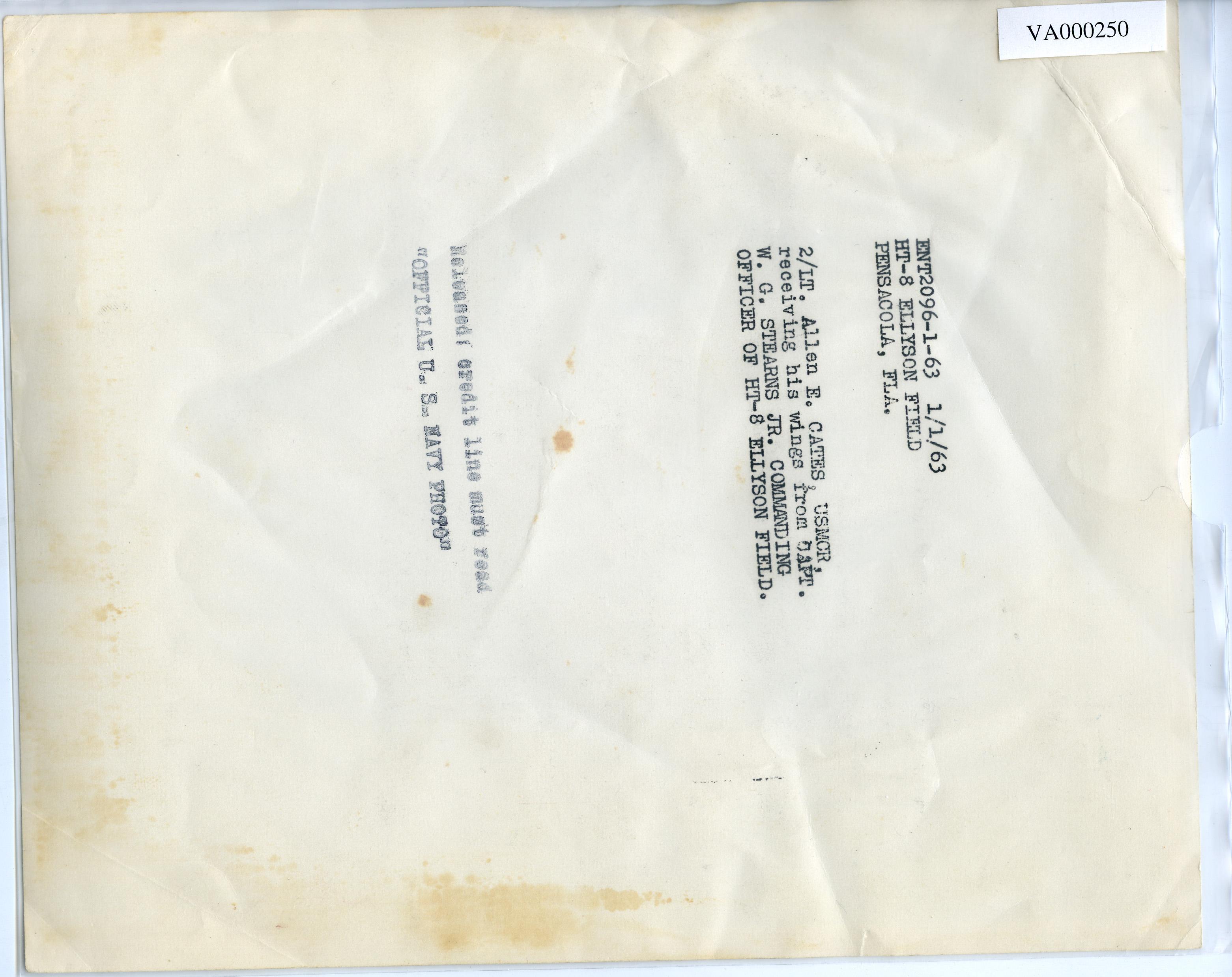 Second Lieutenant Allen E. Cates, USMCR, receiving his wings from Captain W. G. Stearns, Jr., commanding Officer of HT-8 Ellyson Field.