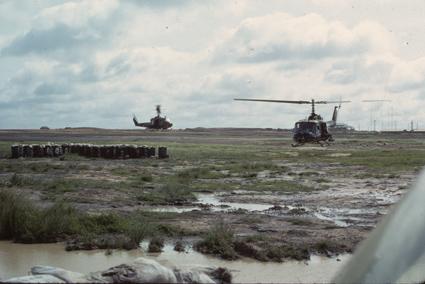 UH-1 Huey helicopters lifting off