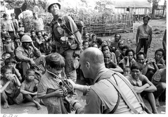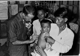 Subject: Doctor (Medic) examines VN Child with stethoscope. Area: Thanh An Village