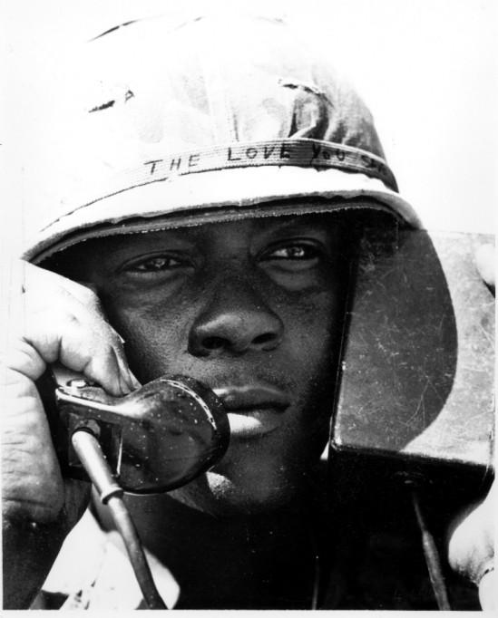 Holding a radio speaker to his ear, Specialist 4 Hubert Tremble of the 25th Infantry Division talks with a Chinook pilot delivering supplies to the 2nd Battalion, 12th Infantry's night laager site. US Army Photo by SP4 Charles Haughey