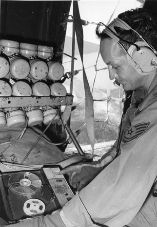 US soldier inspecting recording equipment.