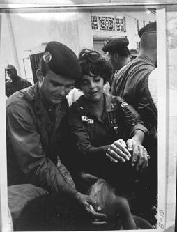 SCRUB 'EM DOWN -- Lieutenant David J. Welch, USN, and 1st Lieutenant Diane Parrett, USA (Nurse Corps), combine to give a young Vietnamese boy a 'bath' prior to his receiving a physical examination. Captain Welch, Advisor to Coastal Group 32, is the son of Mrs. Joseph R. Welch of [address]. Nurse Parrett, attached to the Army's 36th Medical evacuation Hospital at Vung Tau, resides at [address]. (Official US Navy Photo by: J.C. Deckert, PHC, USN) Macoi Military Assistance Command, Vietnam Commander US Navel Forces, Vietnam September 11, 1966