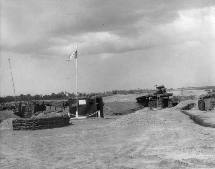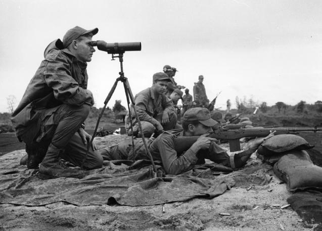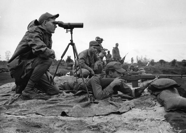 Soldiers looking out binoculars or aiming a rifle from behind sandbags.