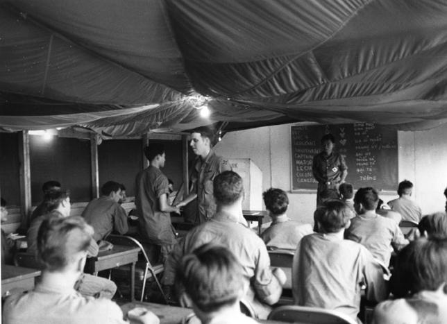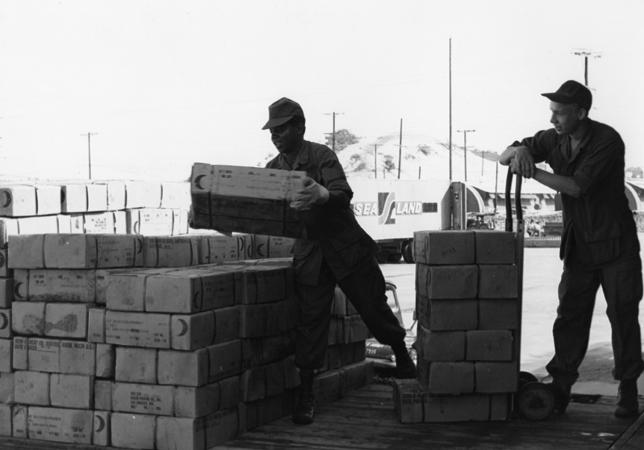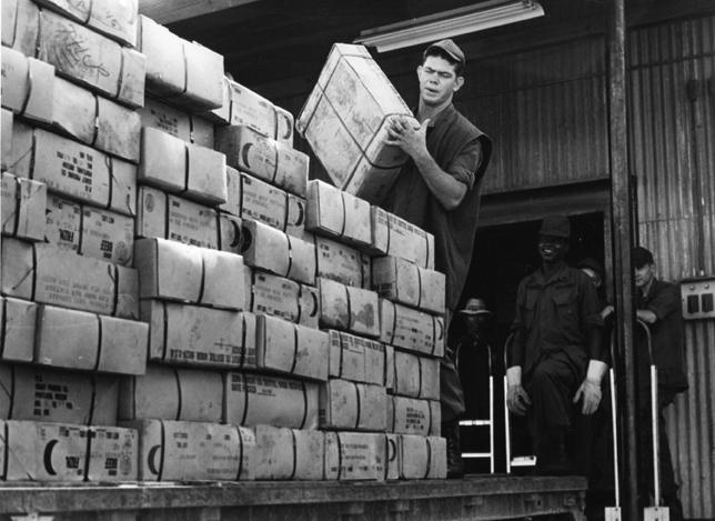 US Army soldiers, with the help of two Vietnamese men, loading boxes.