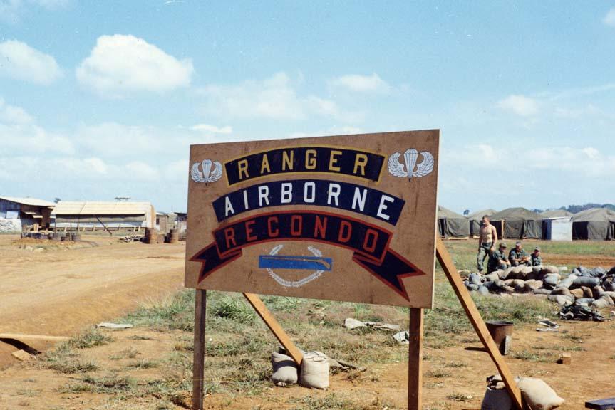 Company camp sign: E Company - Sign: Ranger, Airborne, Recondo ;