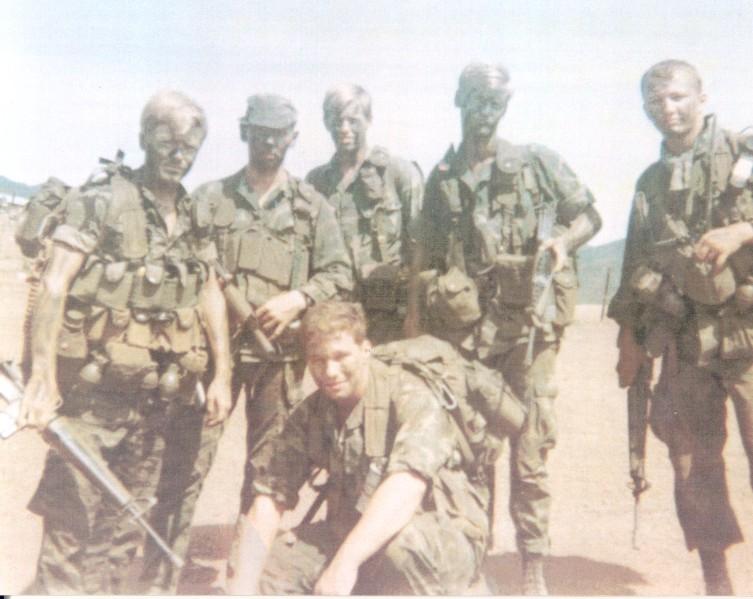 Team 35 C Co (Ranger) 75 Infantry (Airborne) Oasis Pleiku March 1969 L to R George Herringshaw Dan Hobson Tom Sharkey John LaBarge Kneeling Joseph Craig Roger Chambers