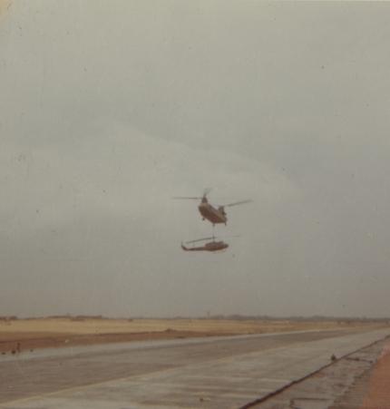 CH47 Chinook carrying a UH-1 Huey; US Army 71st Assault Helicopter Company in Vietnam.