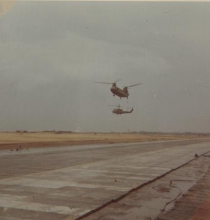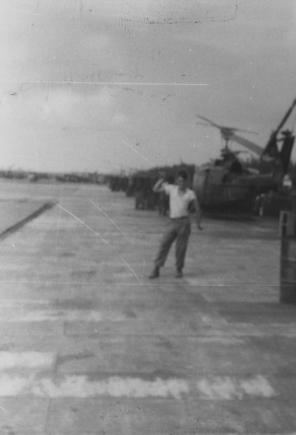 Unidentified soldier; 71st Assault Helicopter Company flight line; US Army in Vietnam.