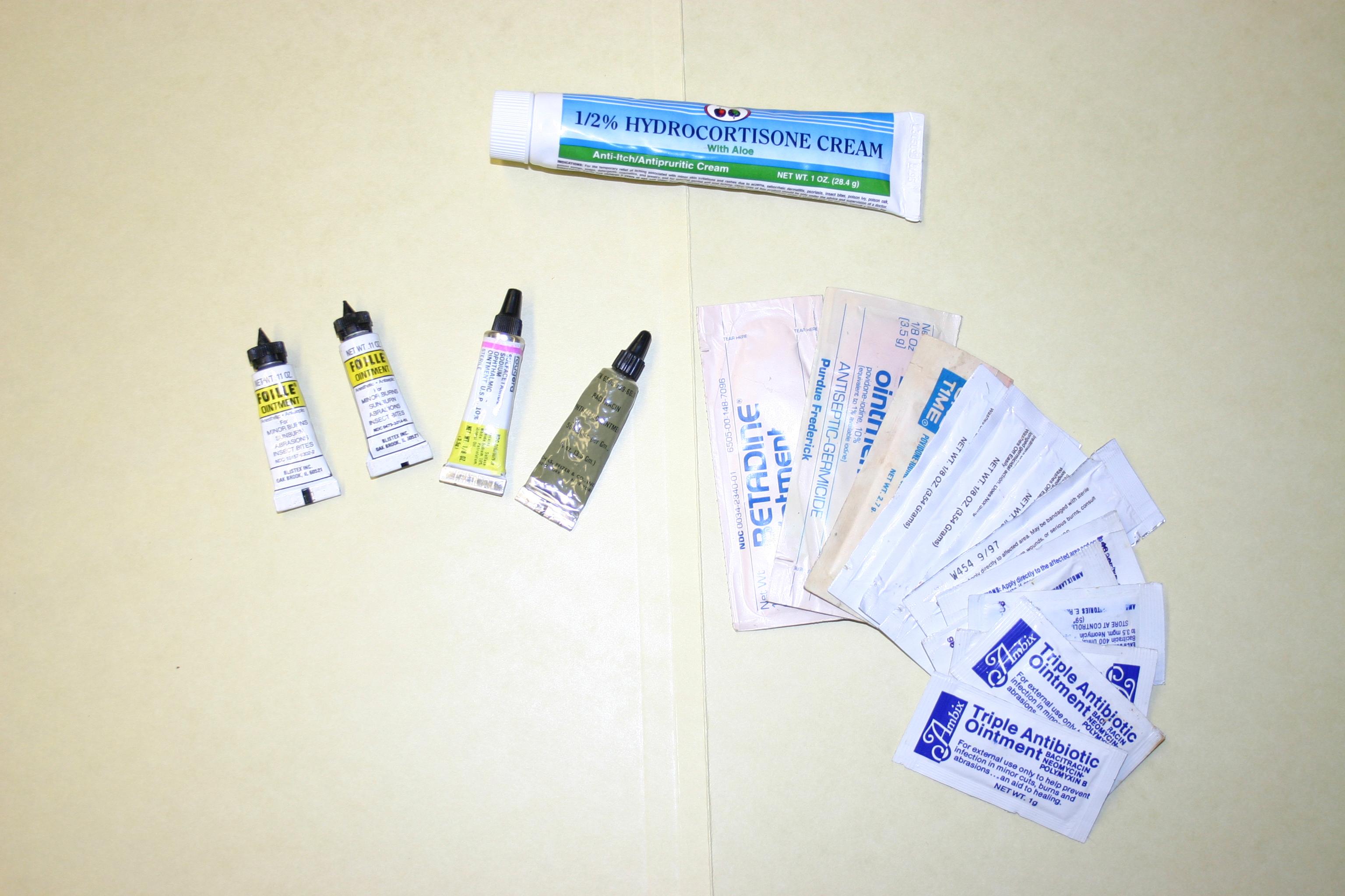 Ointments: for burns (2 tubes); for pink eye (1 tube); anti-bacterial (1 tube); packets; hydrocortisone (1 tube).