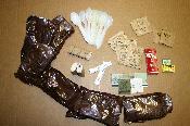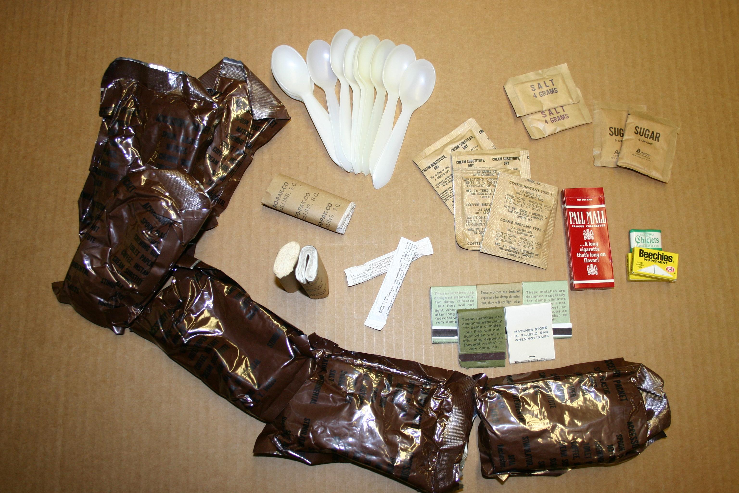 B Ration accessory pack contents: plastic spoon, paper packet of salt, sugar, instant coffee, powdered creamer; toilet paper (single "serving"); matchbook; toothpicks; chewing gum; 4-pack of cigarettes.